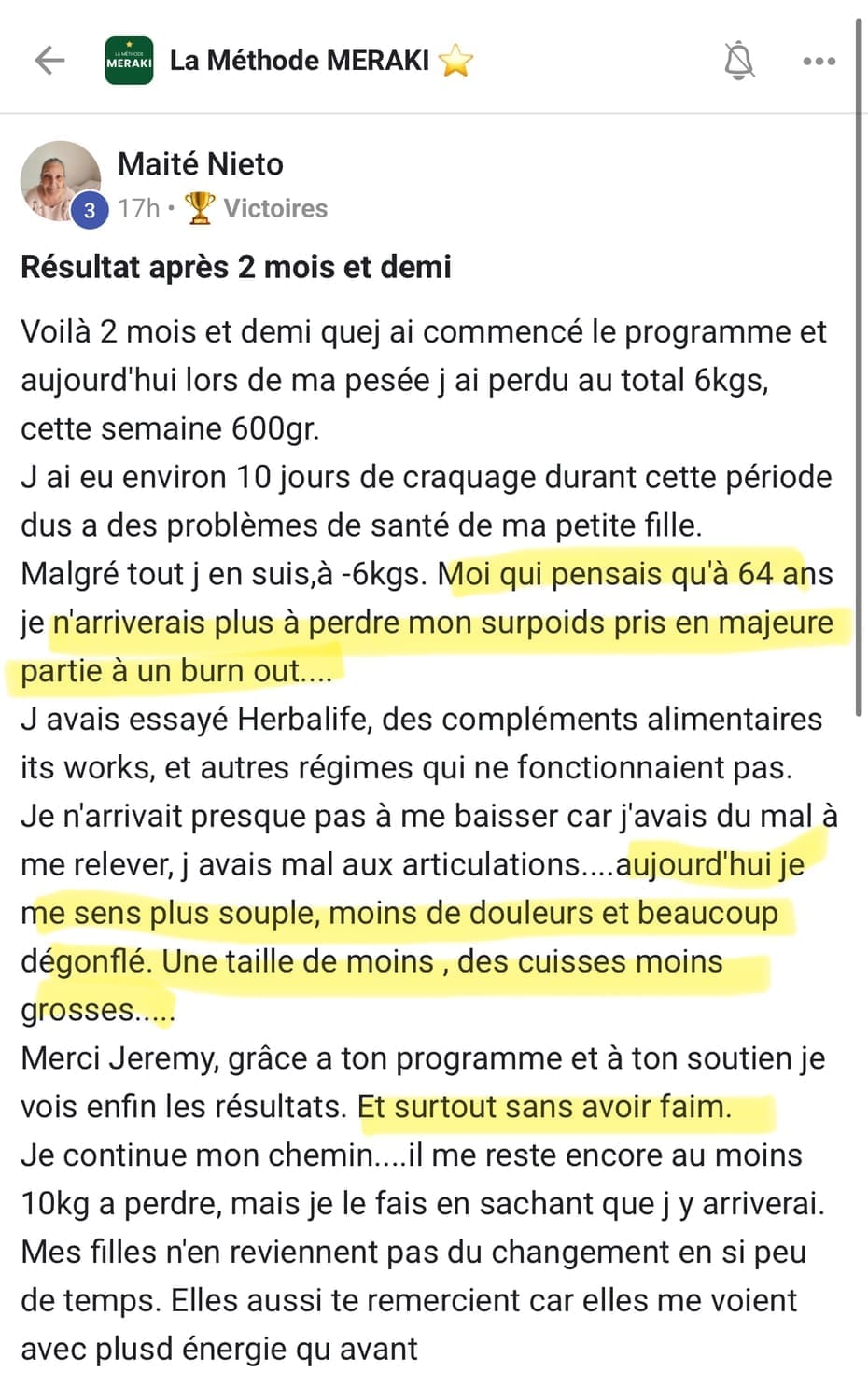Non. Rassure-toi, tu n’as rien à acheter en plus. Aucun shaker, aucune poudre miracle, aucun complément hors de prix. La méthode MERAKI est 100 % naturelle, et justement pensée pour t’éloigner des régimes frustrants et des solutions artificielles. Tu as peut-être déjà essayé Herbalife, Natura House, ou d’autres programmes où tu devais remplacer tes repas par des substituts, prendre des gélules, des sachets, ou suivre des plans rigides… Ici, c’est tout l’inverse.