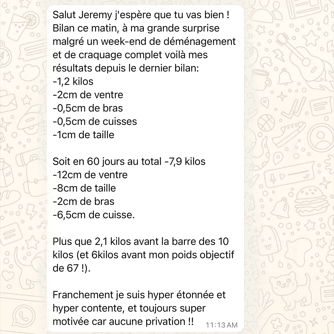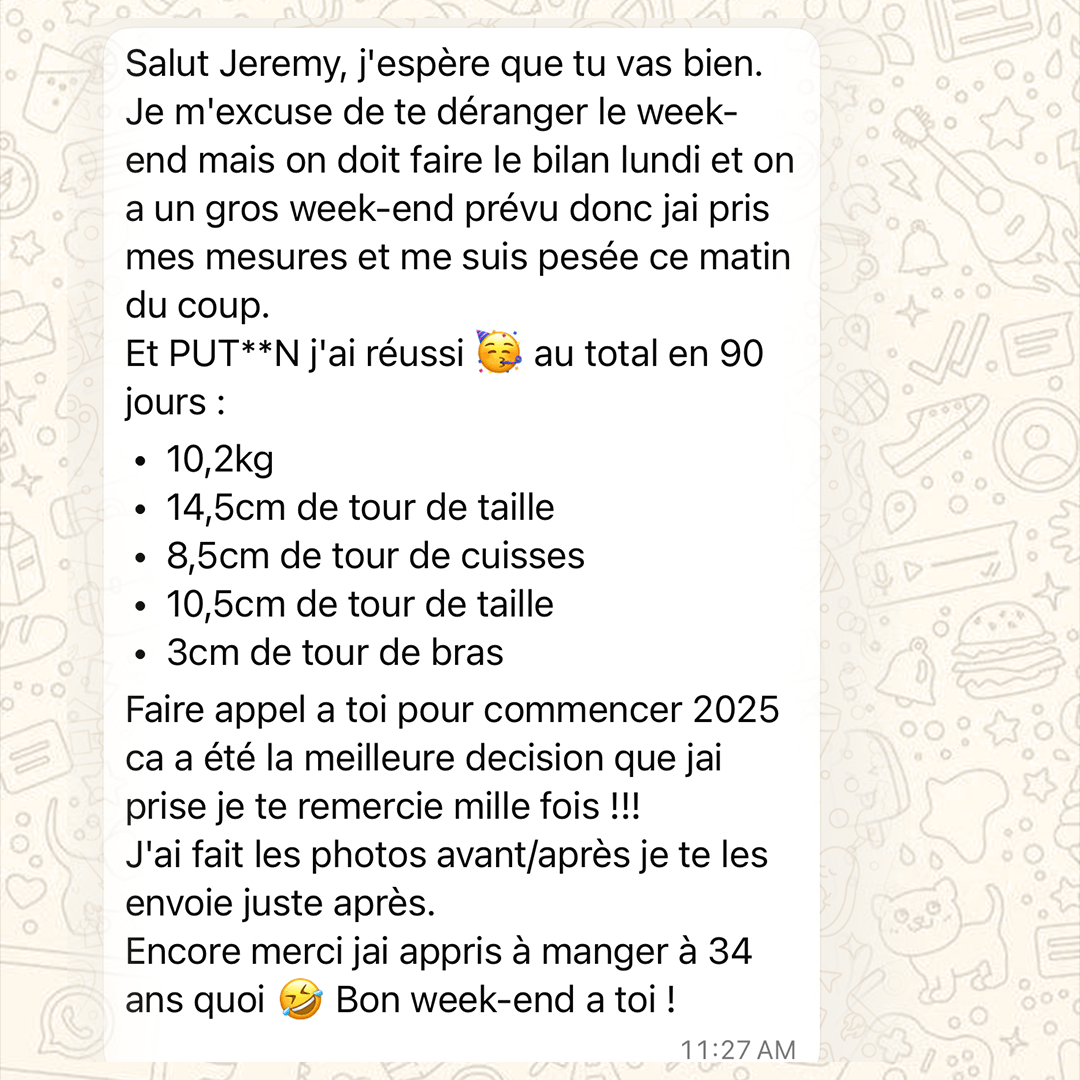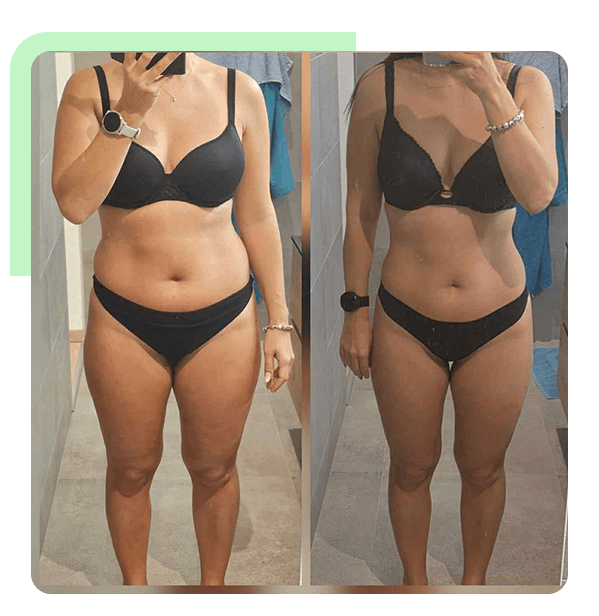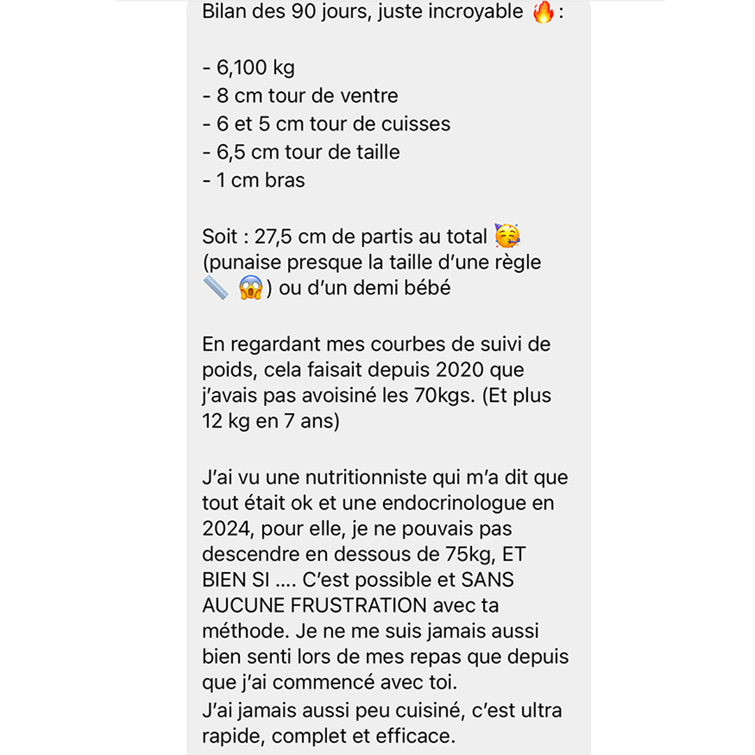 Ça dépend de ton profil, mais la perte est progressive et durable. Pour te donner une idée, les femmes du programme perdent entre 2 et 4kg par mois (tout en ayant une vie normale, apéros, week-end…) L’objectif, c’est un corps dans lequel tu te sens bien pour de bon, pas une perte express suivie d’un effet yoyo.