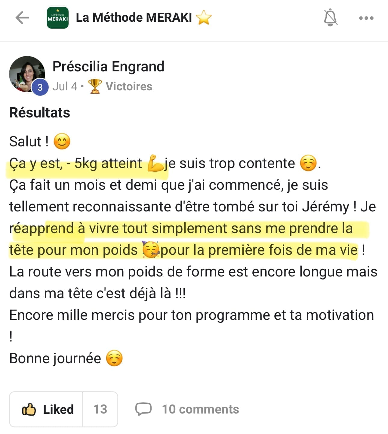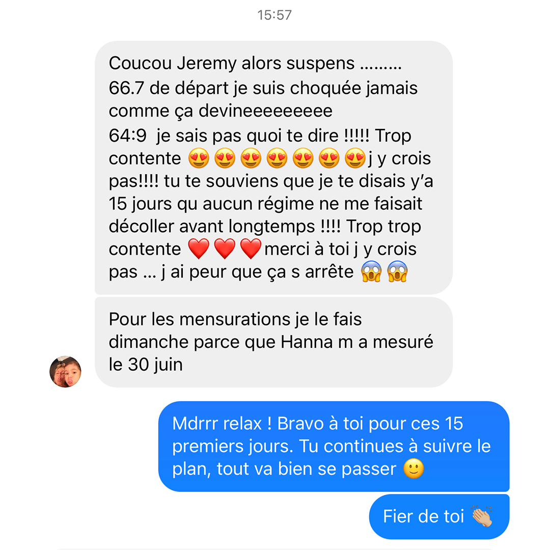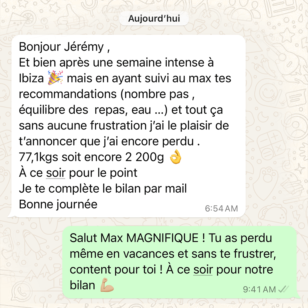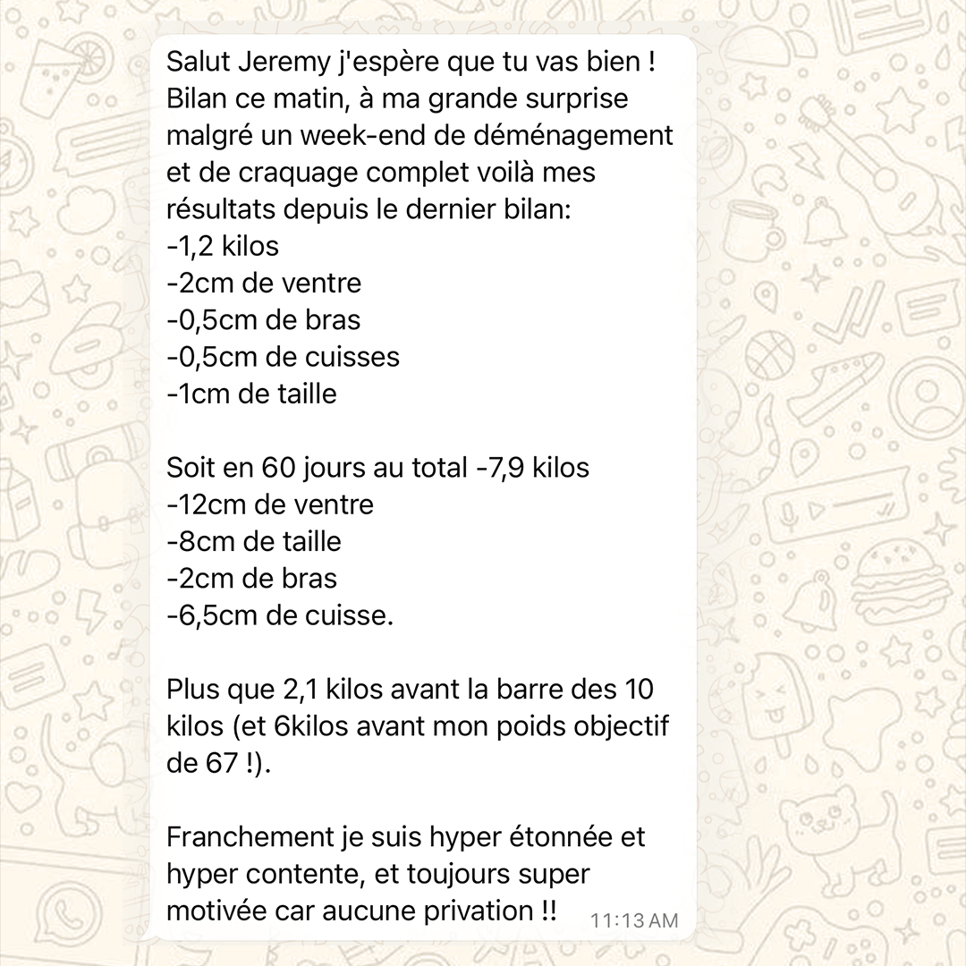 Ça dépend de ton profil, mais la perte est progressive et durable. Pour te donner une idée, les femmes du programme perdent entre 2 et 4kg par mois (tout en ayant une vie normale, apéros, week-end…) L’objectif, c’est un corps dans lequel tu te sens bien pour de bon, pas une perte express suivie d’un effet yoyo.