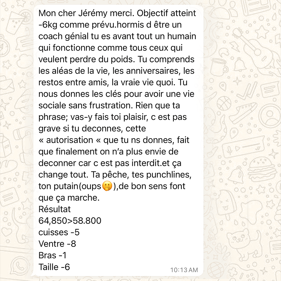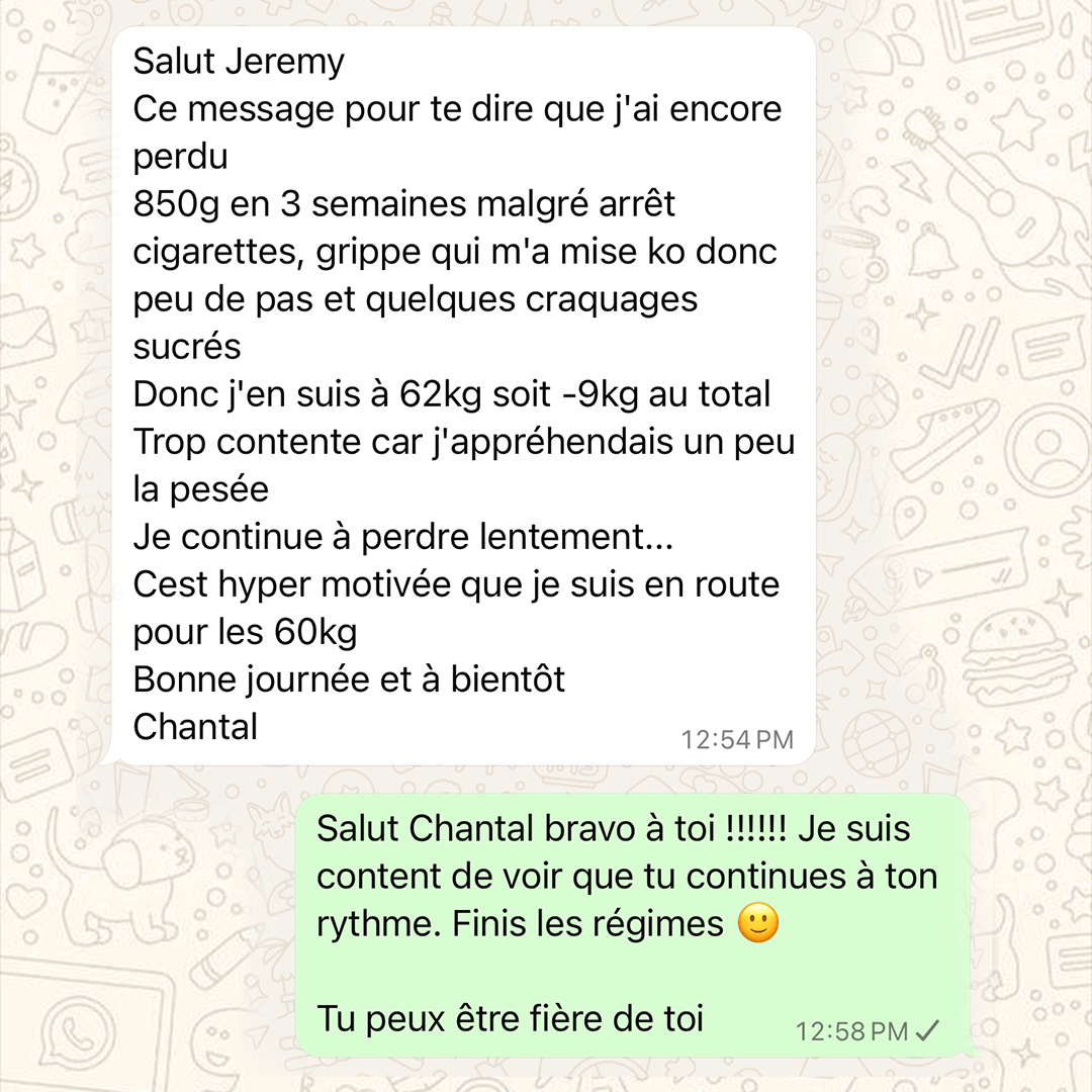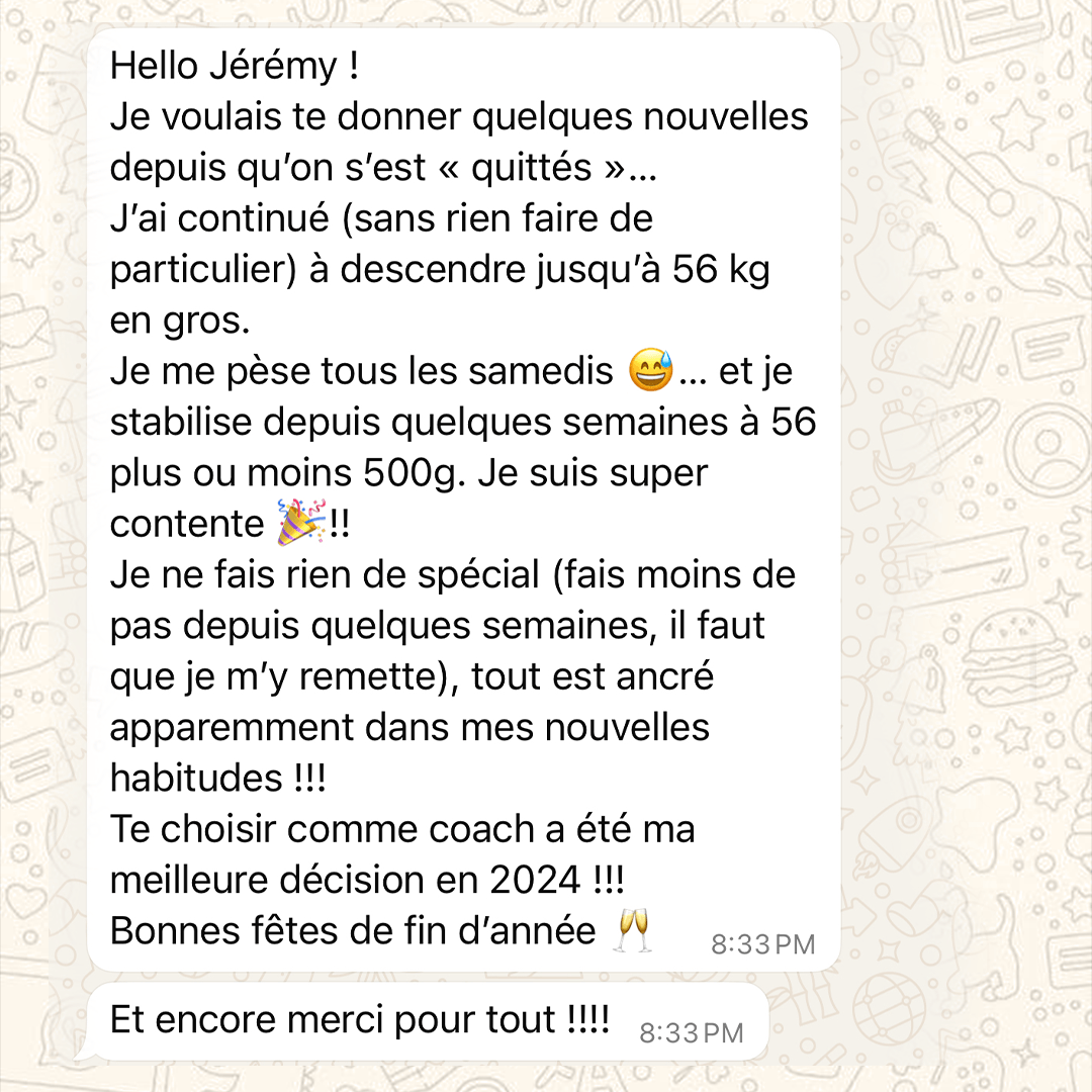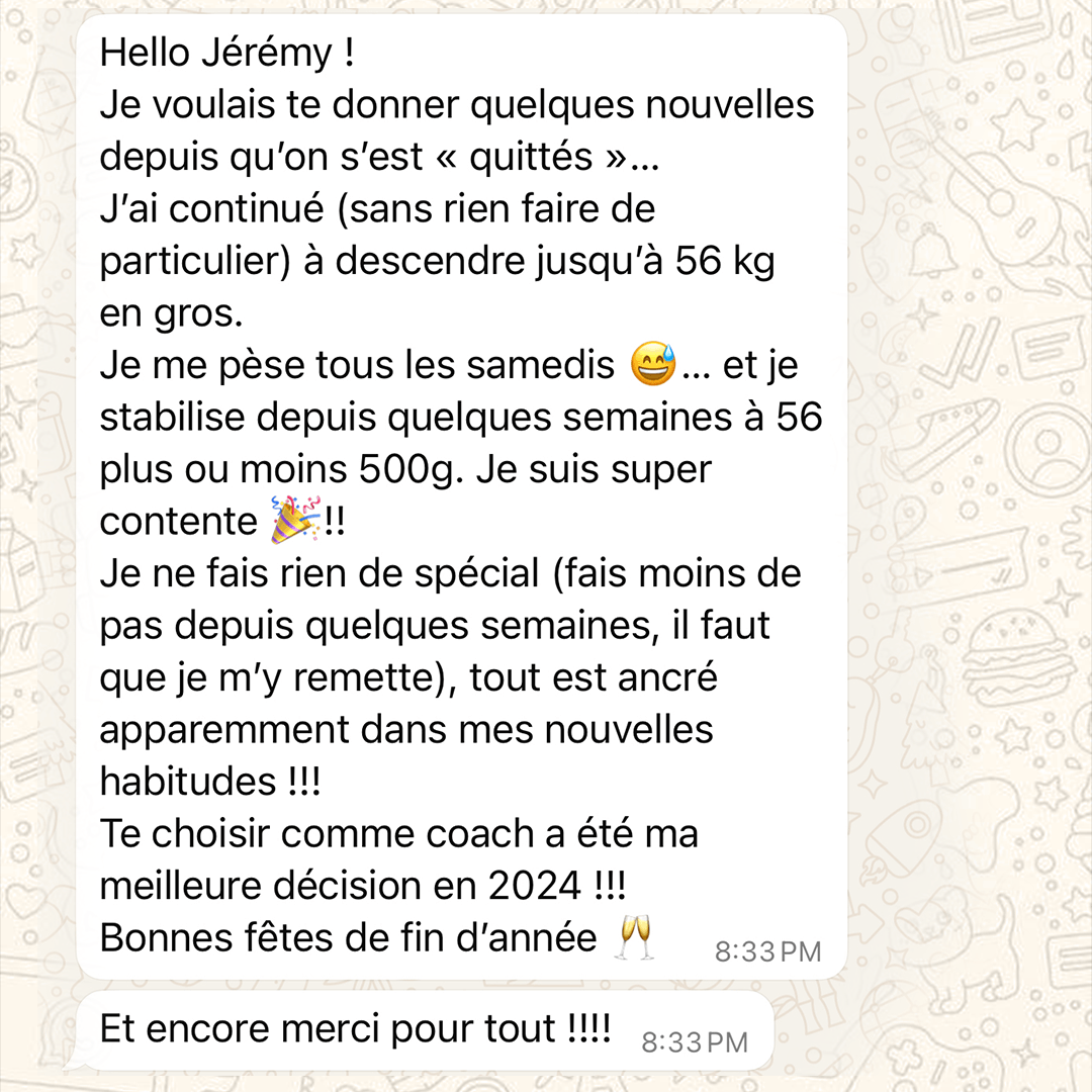 Un cadre simple, bienveillant, qui t’aide à perdre du poids sans violence. Tu reprends confiance, tu te sens mieux dans ton corps, tu avances à ton rythme… et surtout, tu tiens dans la durée.